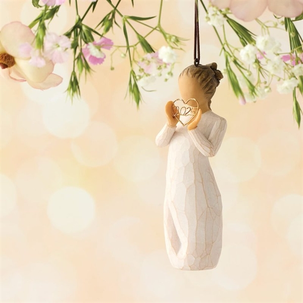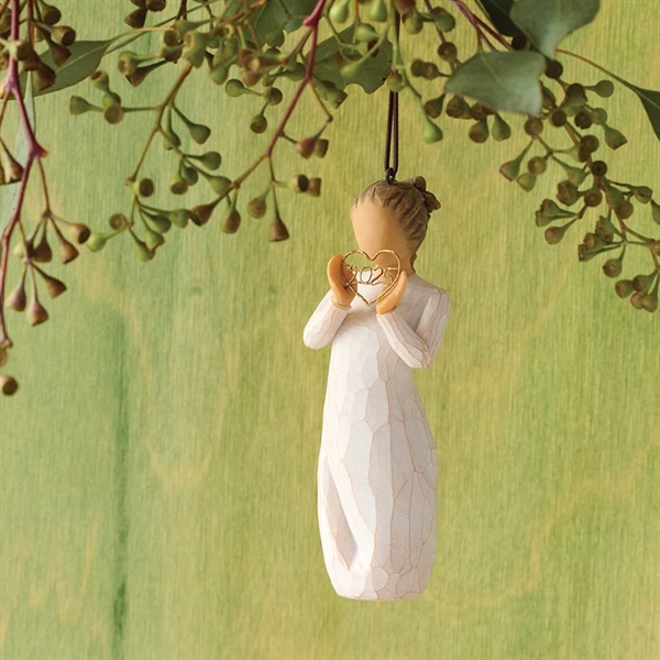 2025 Julgransprydnad (Minnen nära ditt hjärta). Willow Tree 2025 Julgransprydnad – Minnen nära ditt hjärta är en vacker och meningsfull julgransprydnad som symboliserar kärleksfulla minnen och nära relationer. Den handmålade julgransprydnaden visar en kvinna med händerna nära hjärtat – ett enkelt och rörande motiv som är perfekt för en juldekoration.